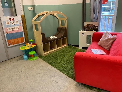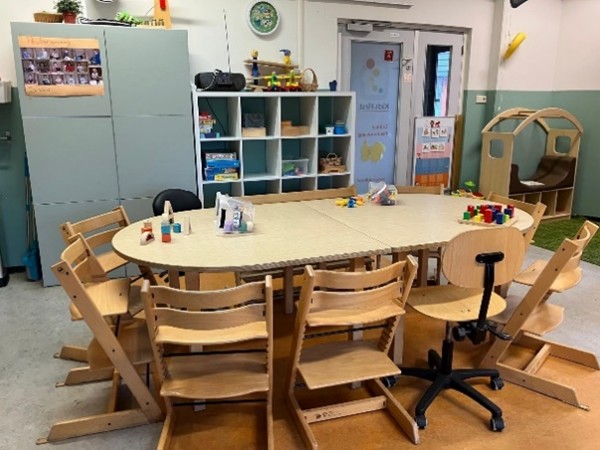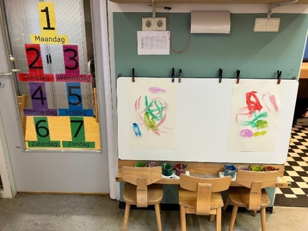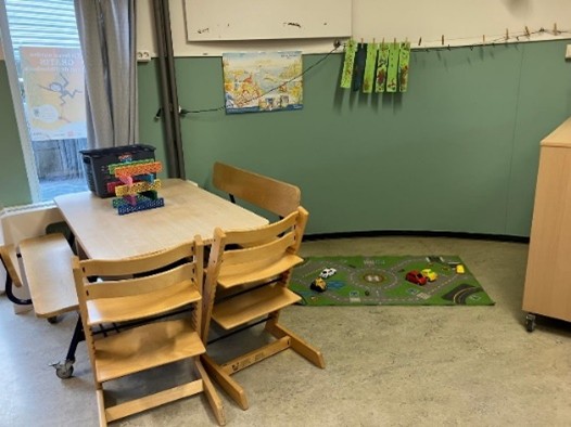 Binnen is onze ruimte sfeervol ingericht in rustige groentinten. Met het houten meubilair en het ruime, gevarieerde aanbod aan speelgoed creëren we een warme en uitnodigende omgeving. Het speelgoed wordt regelmatig gewisseld, zodat het uitdagend en stimulerend blijft voor de kinderen. Een echte favoriet is ons verfbord, waar de kinderen zich creatief kunnen uitleven.